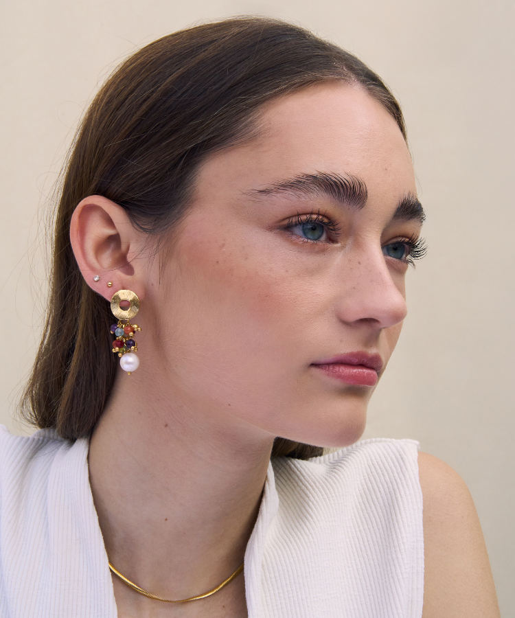 Aro con perlas de río y piedras naturales hiladas a mano se entrelazan con hilos de oro 18 kt para crear esta maravillosa joya. Carretel es un aro que dará el toque perfecto de elegancia y sofisticación a tu tenida.