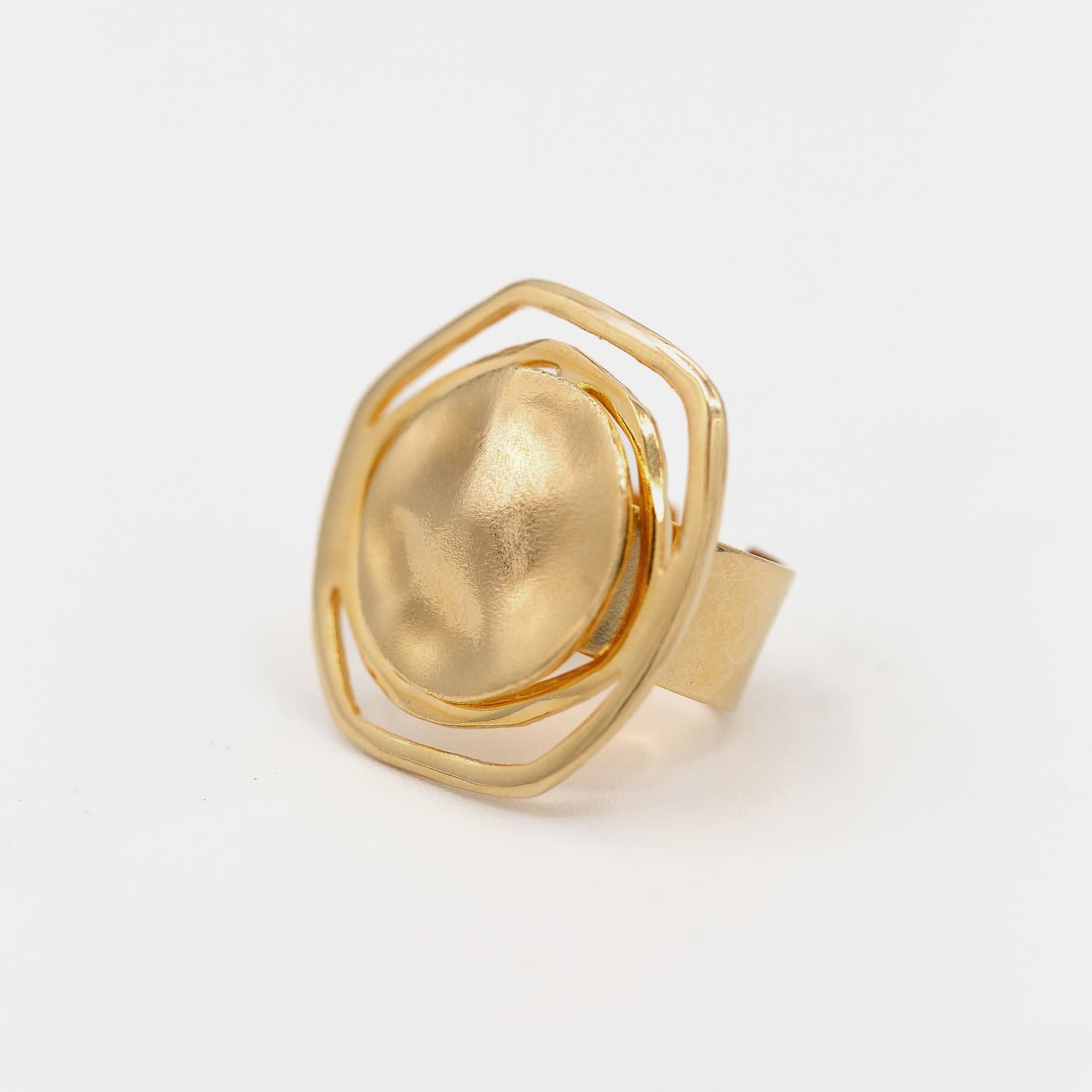 • Terminación satinada de brillo suave • Material: enchape de oro 18K • Diseño ajustable, que permite adaptarlo cómodamente a distintas tallas • La parte superior del anillo mide 2,9 cm x 3 cm • Garantía: 12 meses • Hipoalergénico, libre de níquel