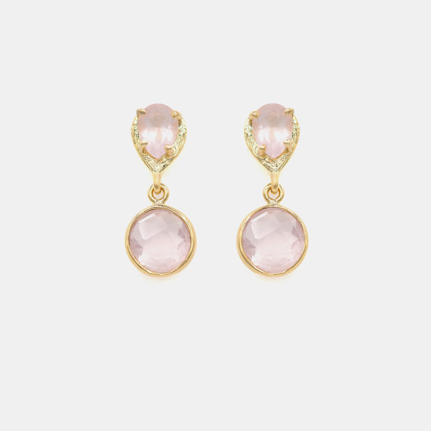 La pieza se compone de dos piedras facetadas en tono rosa que se unen en una caída ligera y armónica. La piedra superior en forma de gota aporta definición, mientras que la piedra circular inferior añade volumen y un brillo suave que acompaña el movimiento.