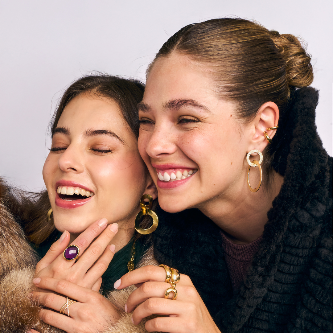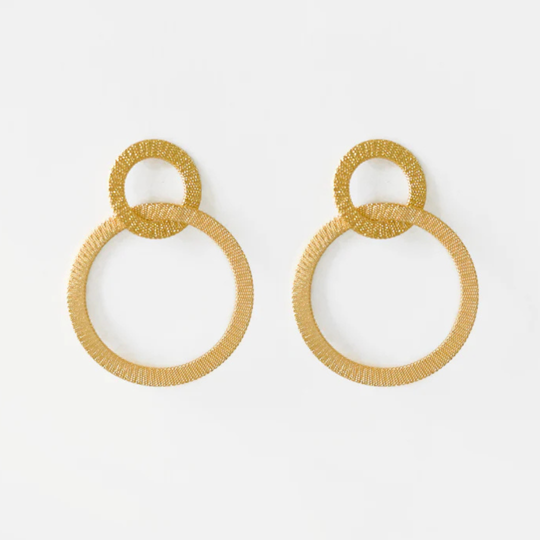 Diseño moderno y sofisticado, estos aros destacan por su doble aro entrelazado en un tono dorado satinado que captura la luz con sutileza. Su forma geométrica y textura refinada los convierte en el accesorio perfecto para elevar cualquier look, desde un atuendo de día hasta una noche elegante. Livianos, versátiles y absolutamente atemporales.