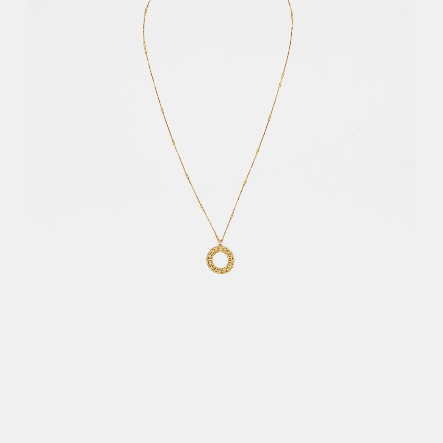 • Medida cadena: 40 cm + 5 cm extensor • Detalle: Colgante circular con terminación texturada • Material: Enchape de Oro 18K • Garantía: 12 meses • Hipoalergénico, libre de níquel