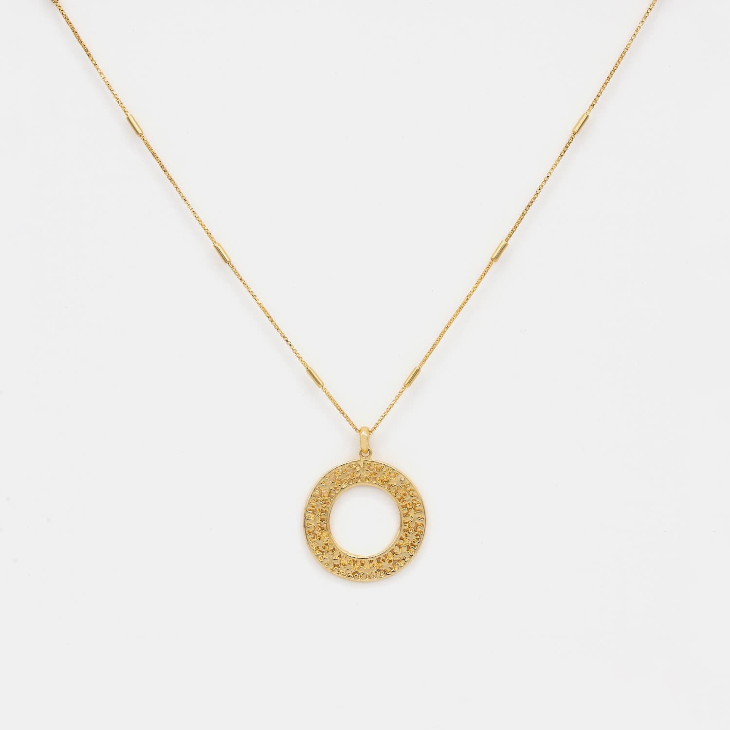 La cadena fina sostiene un círculo central trabajado con una terminación satinada que aporta profundidad y carácter a la joya. Este acabado, cuidadosamente trabajado, crea un juego de luz sutil que resalta la forma del diseño.