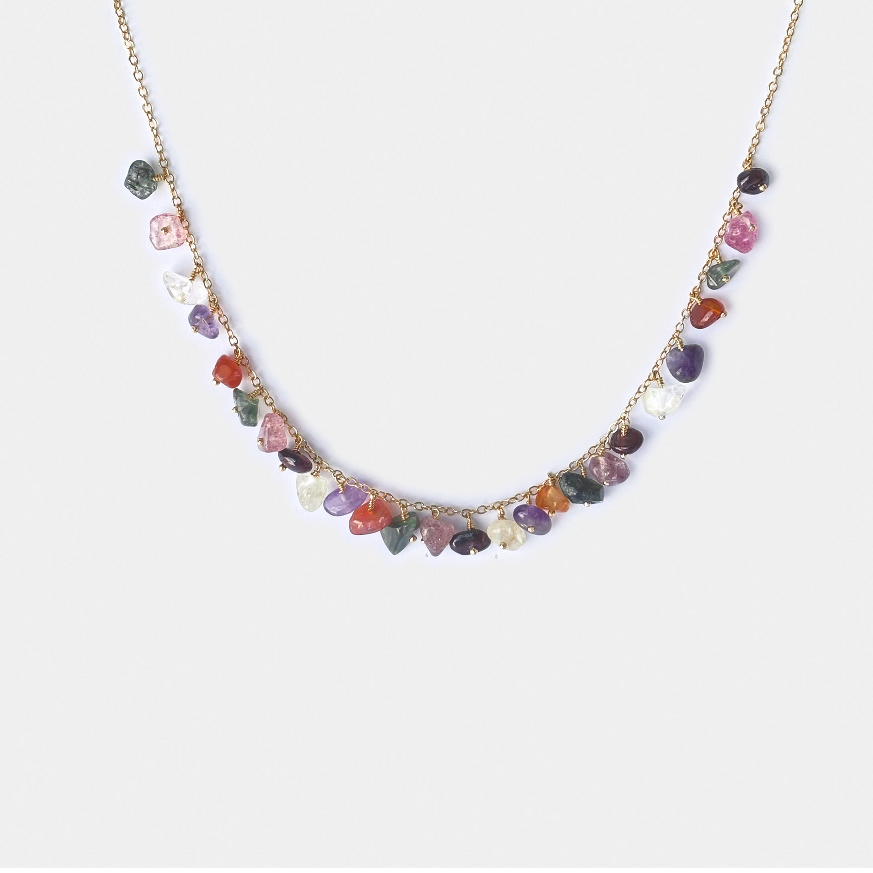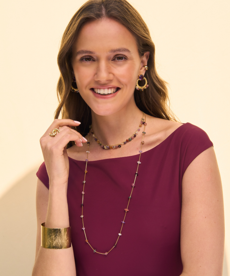 El collar Mallorca es el complemento perfecto para quienes buscan un detalle luminoso y elegante en su día a día. Confeccionado en oro 18K y adornado con piedras naturales hiladas a mano, esta pieza logra un equilibrio entre frescura y sofisticación. Perfecto para llevarlo sólo o junto con los aros y pulsera Mallorca para completar un look coordinado y lleno de estilo.