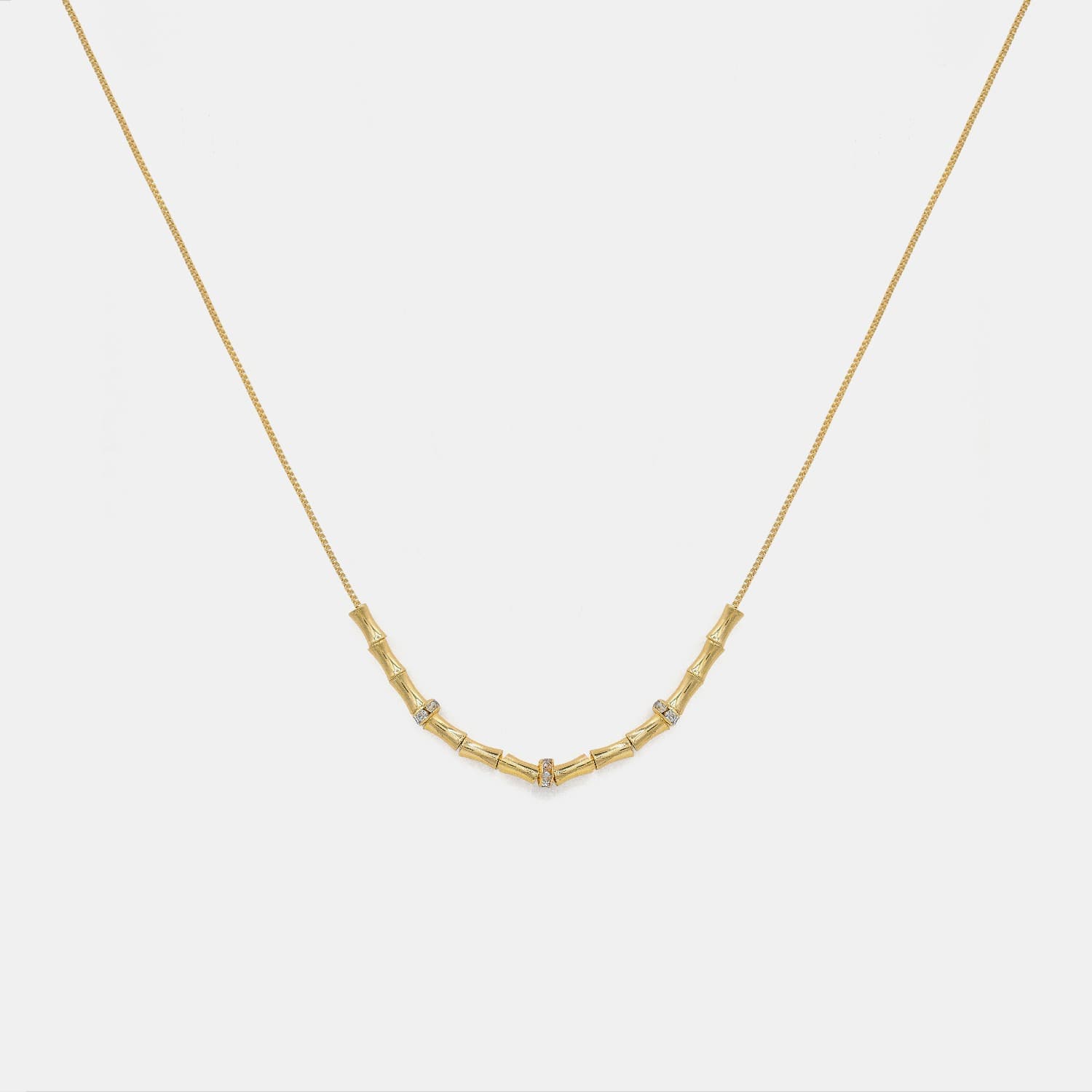 Un collar de líneas delicadas que destaca por su sutil trabajo de composición y brillo refinado.En el centro, una secuencia de pequeñas piezas engastadas con circones crea un juego de luz elegante y discreto. Es una joya pensada para quienes buscan elegancia en los detalles: una pieza femenina, luminosa y fácil de combinar, ideal para acompañar tanto el día como la noche.