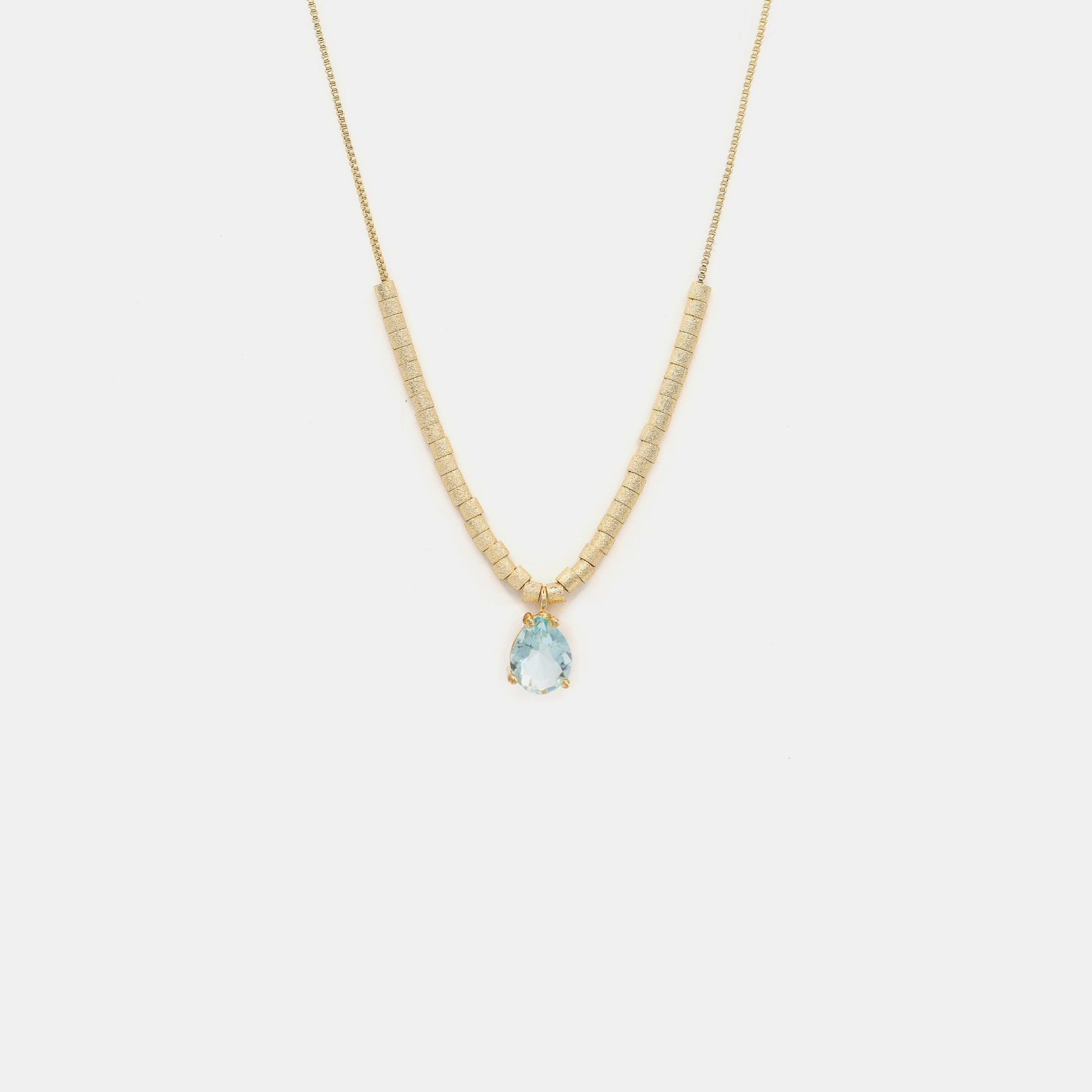 Como protagonista, una piedra facetada en tono agua marina aporta frescura y claridad, captando la luz con un brillo delicado que contrasta con la suavidad satinada del metal.
