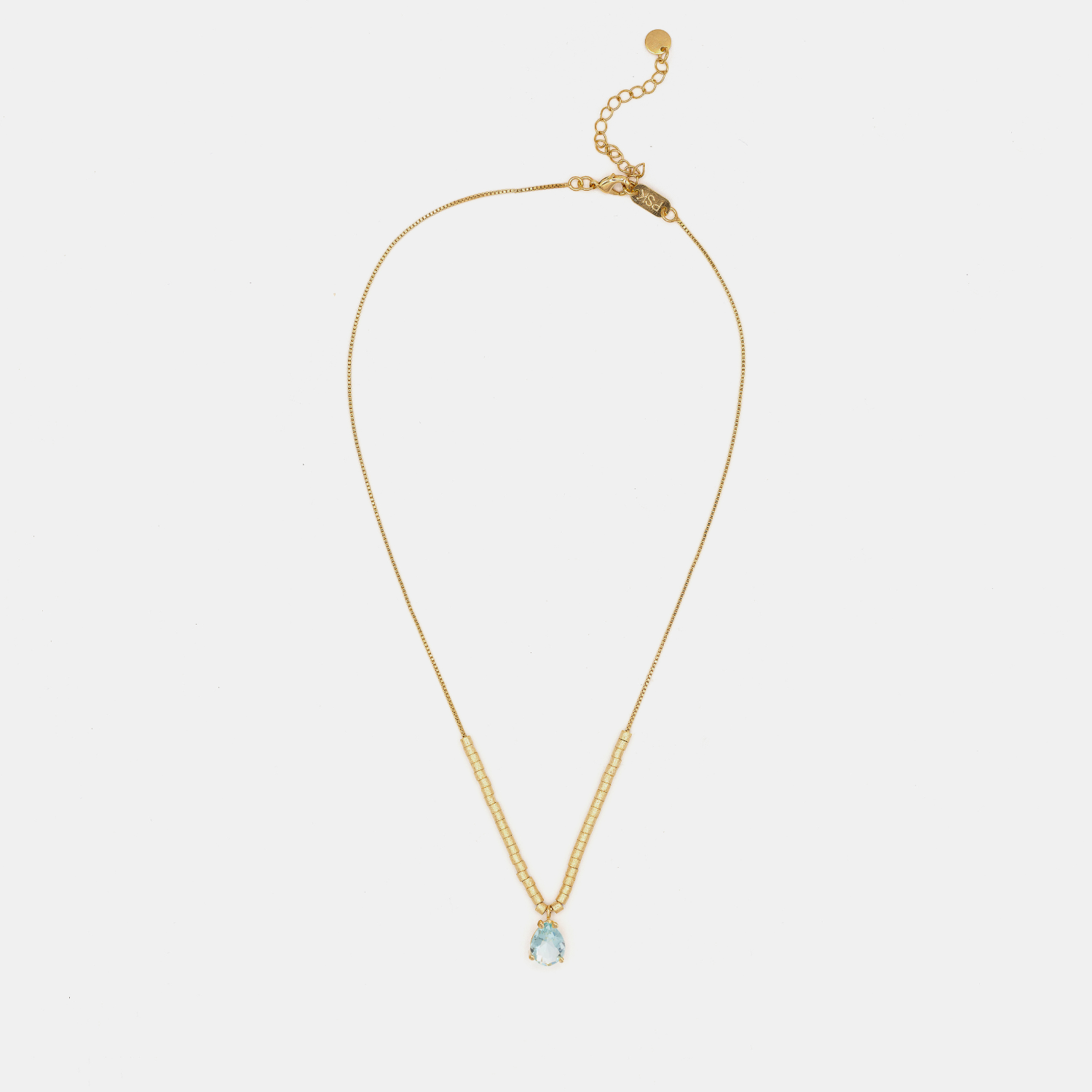 En el centro del collar, una secuencia de mostacillas con terminación satinada, hiladas cuidadosamente una a una, crea una composición luminosa que aporta textura y profundidad al diseño.